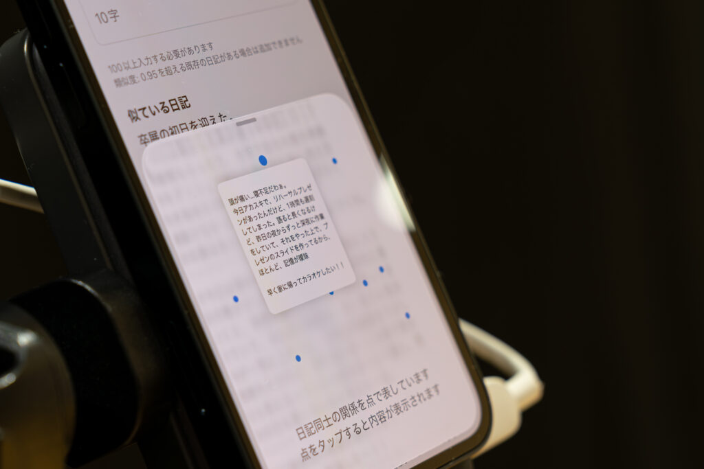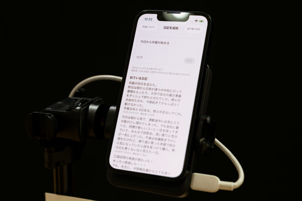 Something Newは,同じような日々の繰り返しに退屈している人のために制作した日記アプリケーションである.本作品では,過去に書いた日記と同じような内容を新たに追加できない.体験者が入力した日記はエンベディングモデルでベクトルに変換され,新しい日記と過去の日記のベクトルの類似度が比較される.類似度が高い場合,その日記は保存できない.また,日記同士の関係を点で視覚化することができる.似た日記はそれぞれを表す点が近くに配置されるため,体験者が自身にとって新しいことが何かを考えることができる.これらの機能によって,体験者は新しい経験や気づきを意識しながら日々を過ごし,振り返ることが可能になる.